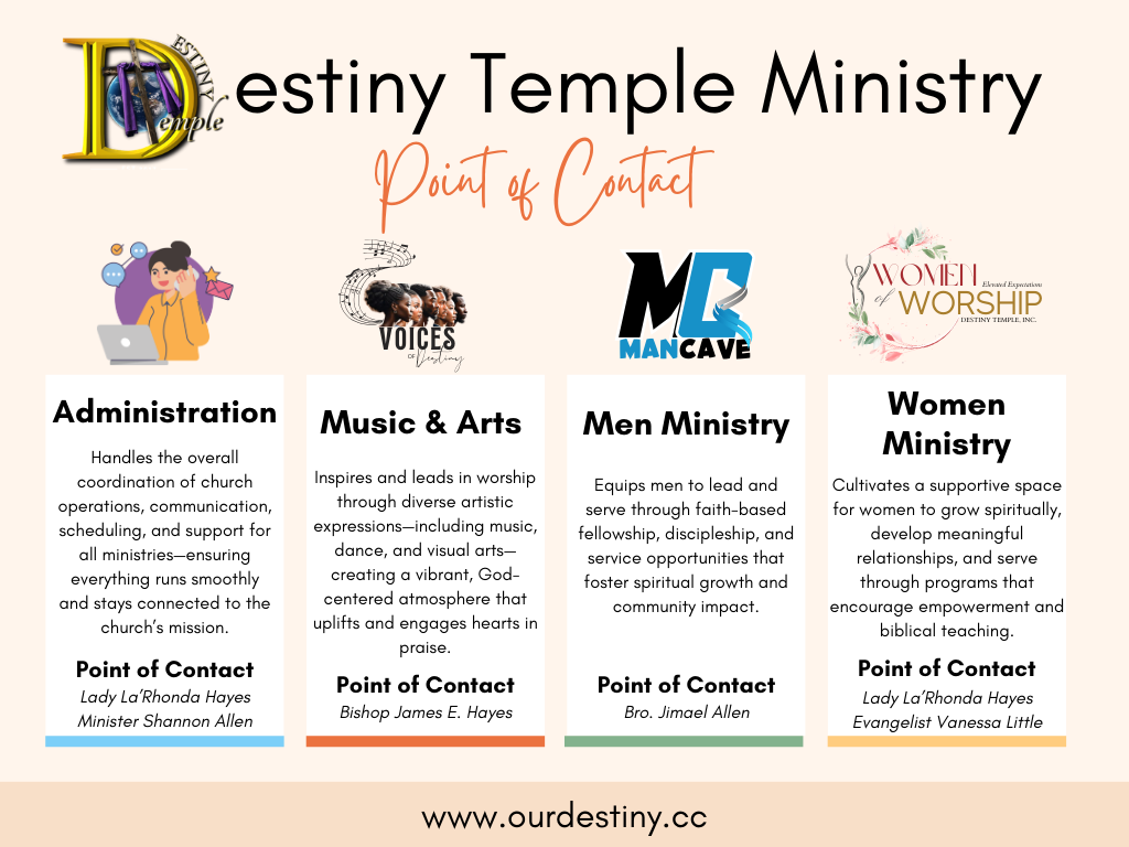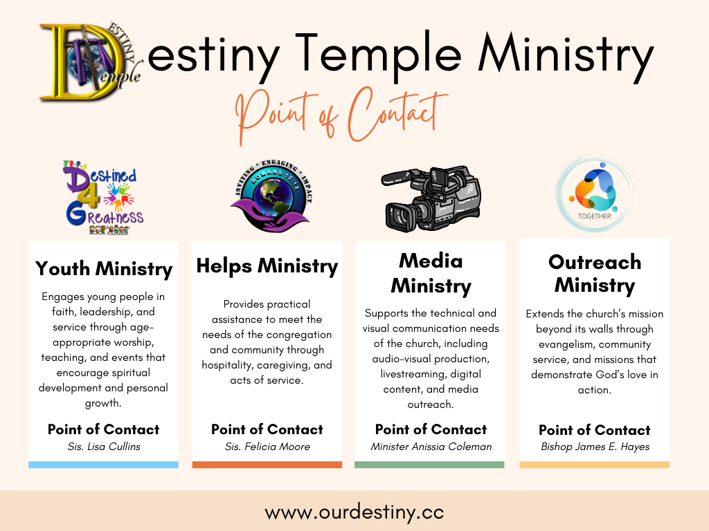 Destiny Temple Youth Ministry seeks to be the place where all young people can gain personal knowledge and establish a solid relationship with Jesus Christ, so that they can become the well-equipped disciples that will witness for the Kingdom of God. [Learn More]