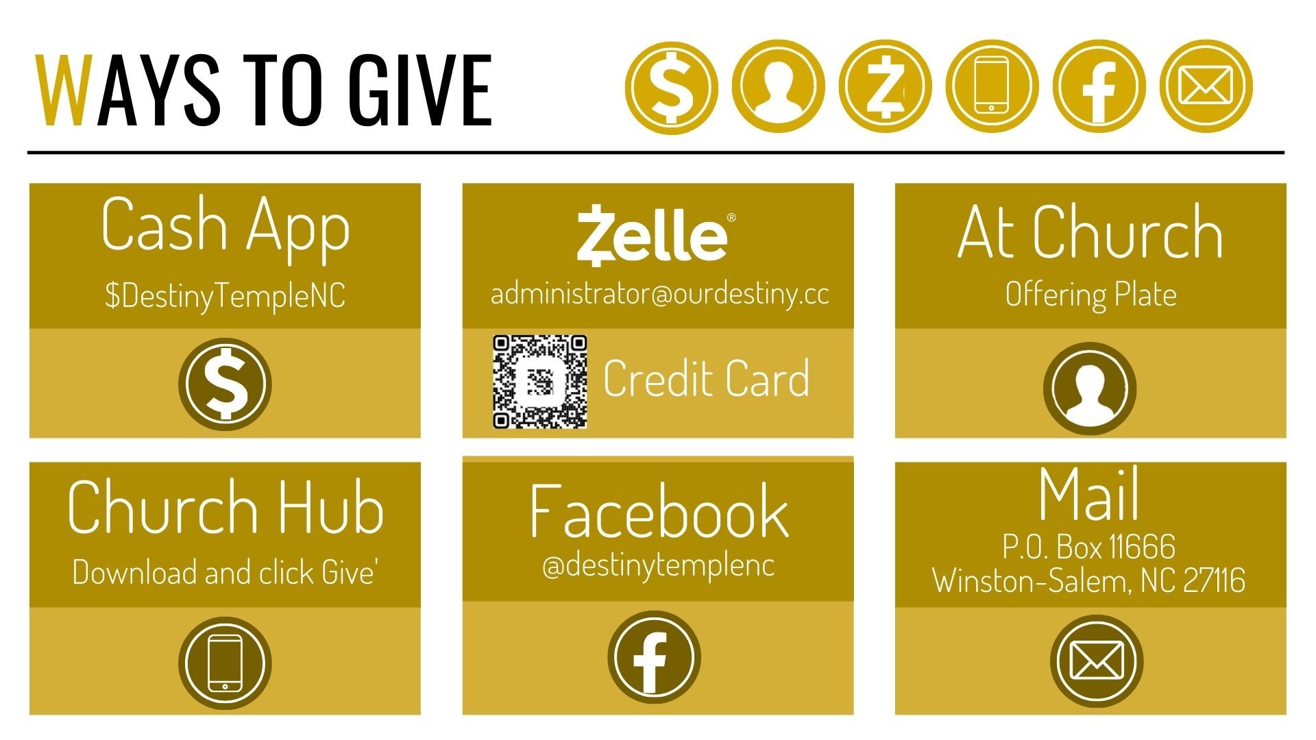 Thank you for choosing to give into the ministry of Destiny Temple. We are committed and focused to do all that God has purposed for us to do. With your contribution and faithfulness in being obedient to the scriptures of God's command, we can do the work that God has entrusted us to do.